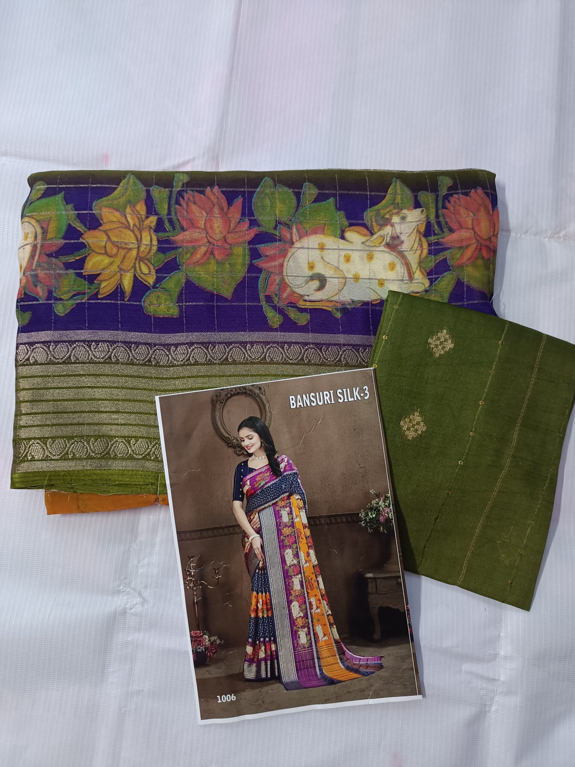 Add a touch of traditional artistry to your wardrobe with this elegant Bansuri silk saree. The saree features a rich maroon base highlighted with a fine check pattern and vibrant floral and cow motifs across the pallu, giving it a distinctive handcrafted appeal. The contrasting striped border adds depth and sophistication, while the smooth silk texture ensures a graceful drape. Paired with a solid contrast blouse embellished with subtle woven buttas, this saree is perfect for festive and cultural occasions.