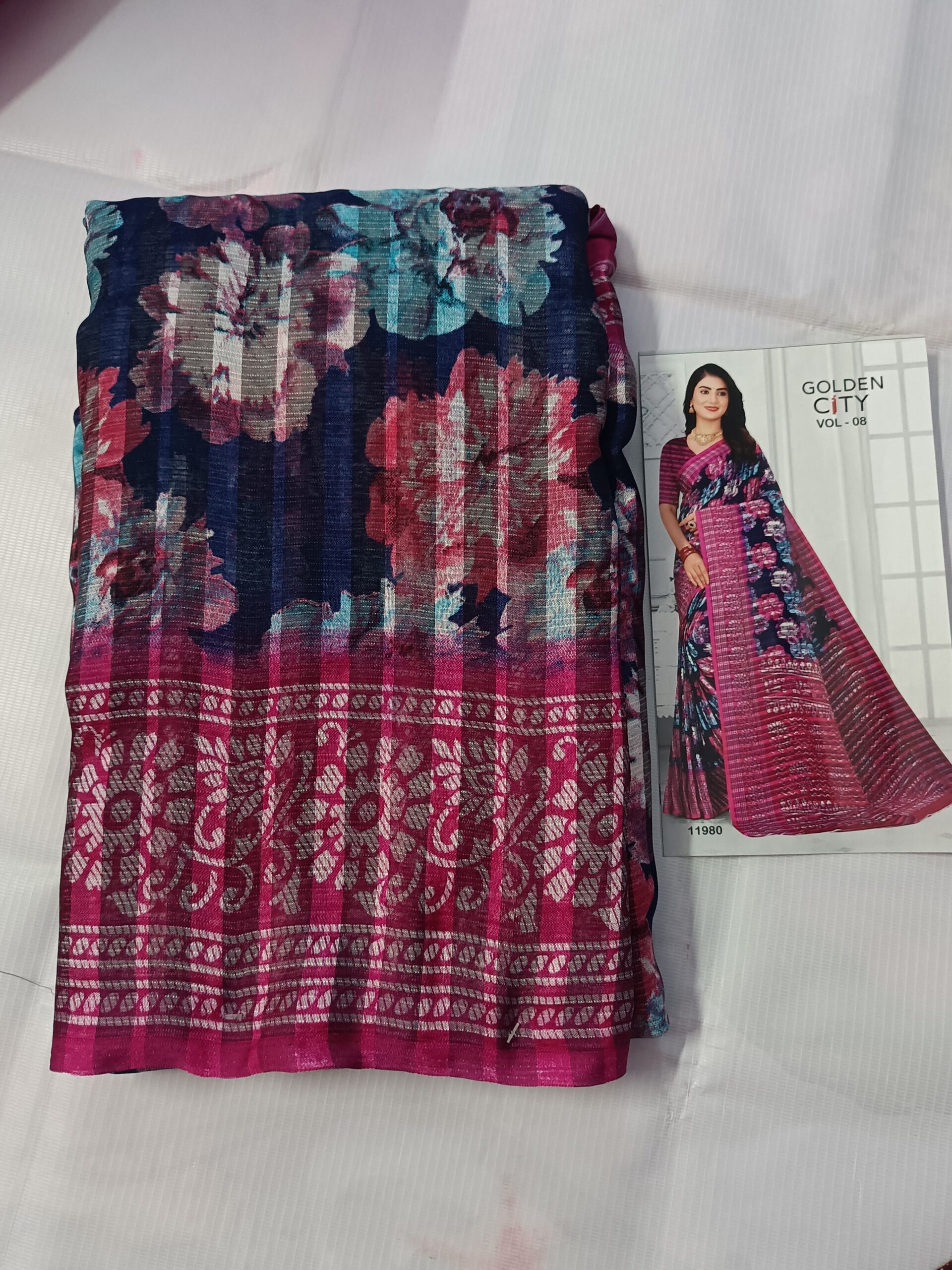 This beautiful dark blue saree features a graceful combination of floral prints and fine vertical stripe texture, giving it a rich and sophisticated look. The body is adorned with artistic rose floral motifs in subtle earthy tones, creating a timeless and elegant appeal.