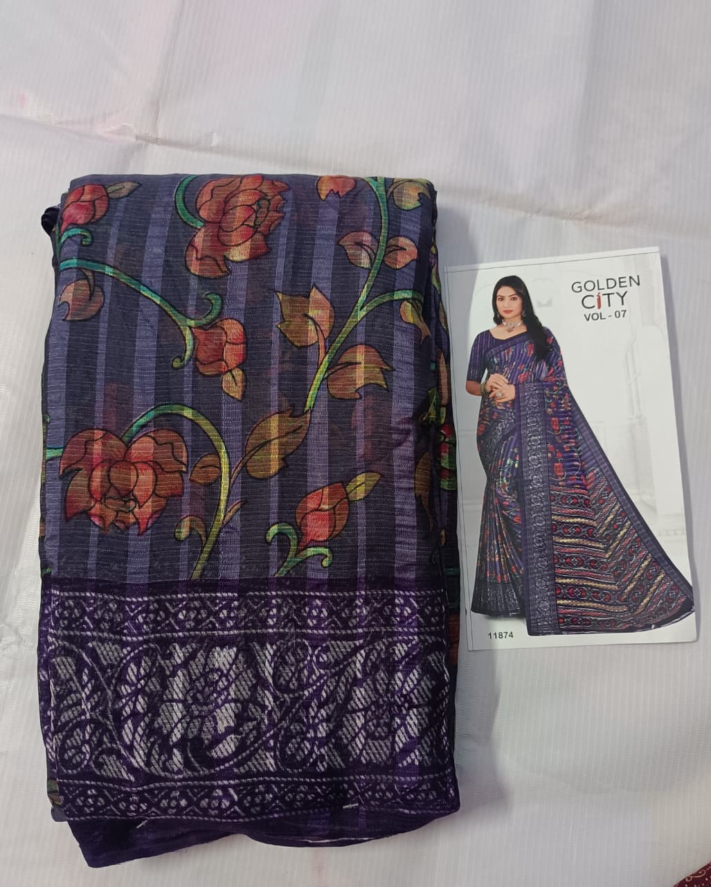 The saree is highlighted with a contrasting richly designed border, showcasing intricate traditional patterns that add depth and charm to the overall look. Crafted in a lightweight and breathable fabric, this saree ensures all-day comfort while maintaining a classy drape