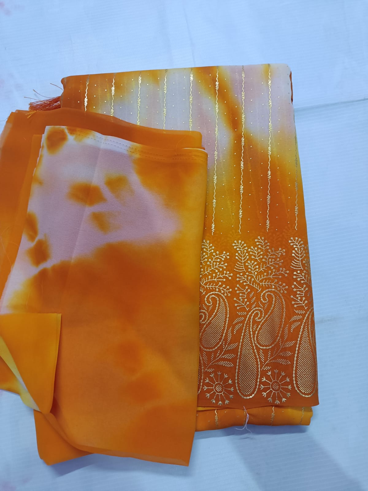 This stunning orange shaded saree features a beautiful blend of light cream and rich orange tones, giving it a graceful and refreshing look. The body is enhanced with subtle golden vertical shimmer lines and tiny dotted accents, adding a soft festive glow.