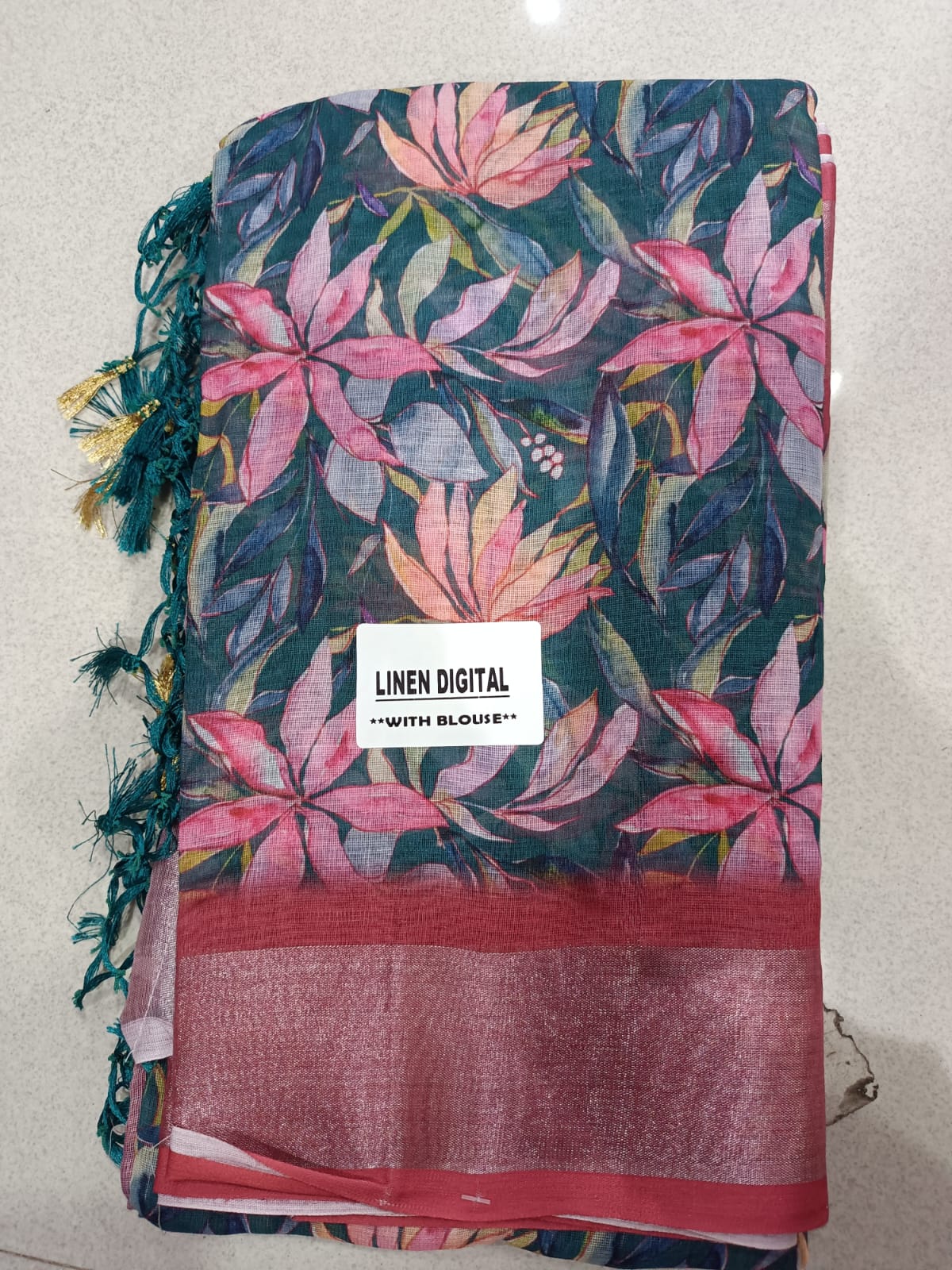 Linen Digital Printed Saree with flowers and