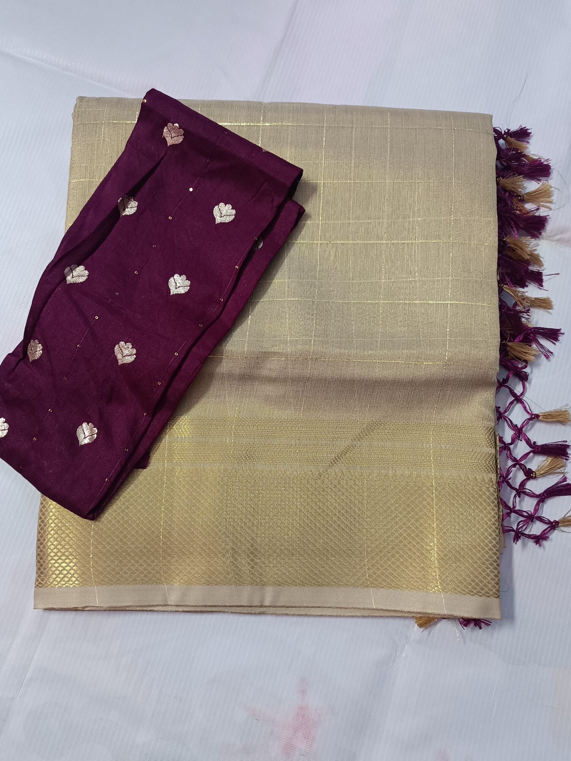 Grace your ethnic wardrobe with this classic Maroon and gold woven saree, designed for timeless elegance. The saree features a rich golden body with subtle woven stripes, beautifully paired with a deep Maroon blouse piece highlighted by delicate silver butti motifs. The finely finished gold border and tasseled pallu add a traditional and festive touch.