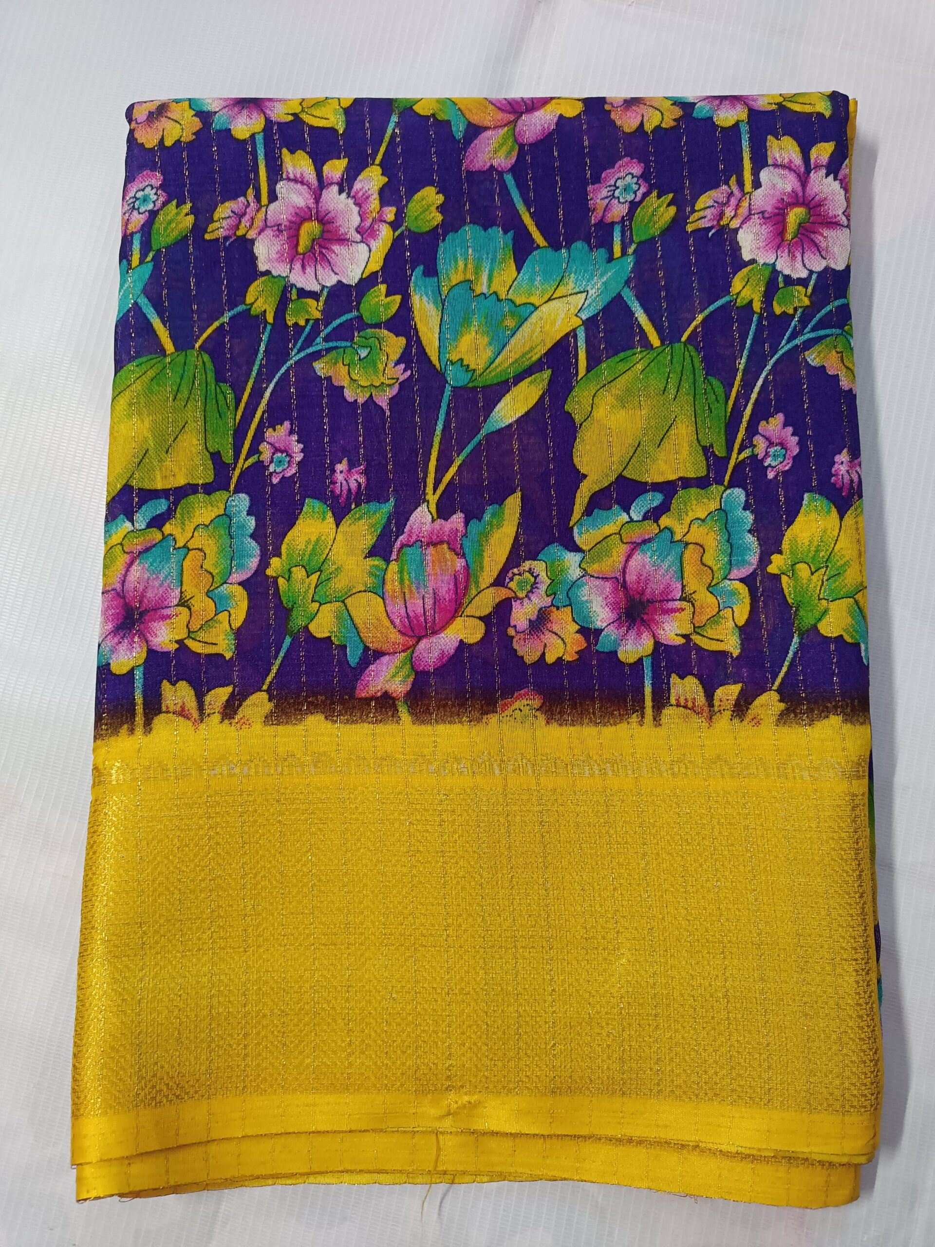 Add a touch of elegance to your wardrobe with this beautiful floral printed saree, featuring a rich deep purple base adorned with vibrant multicolor floral motifs. The saree is highlighted with a striking golden-yellow border and pallu, giving it a perfect blend of tradition and modern charm.