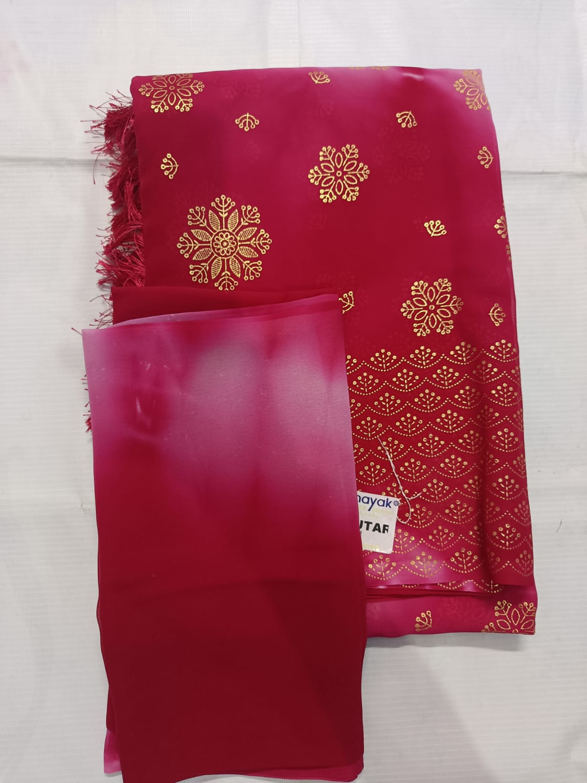 This beautiful maroon shaded saree features a graceful blend of deep maroon and soft pink tones, giving it a classy and feminine appeal. The body is adorned with delicate golden floral motifs evenly spread across the saree, adding a subtle festive charm.