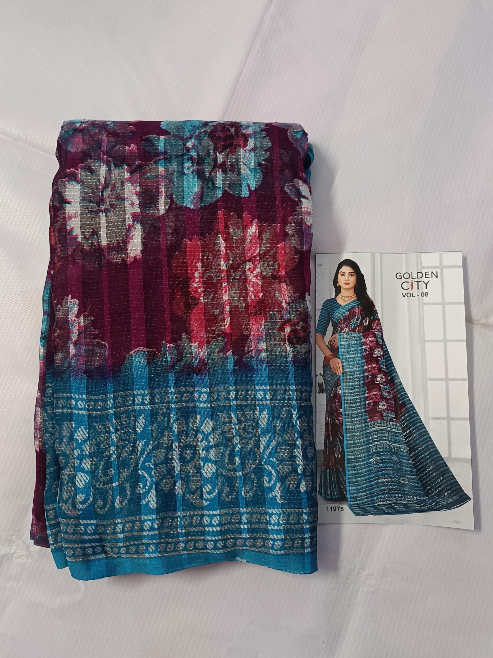 This graceful saree comes in a rich wine/maroon base adorned with beautiful multicolor floral prints, creating a timeless and elegant appeal. The saree features subtle vertical stripes that enhance its overall look, while the contrasting teal blue pallu and border with traditional woven motifs add a refined finishing touch. Made from soft, lightweight fabric, this saree drapes effortlessly and is comfortable for all-day wear.